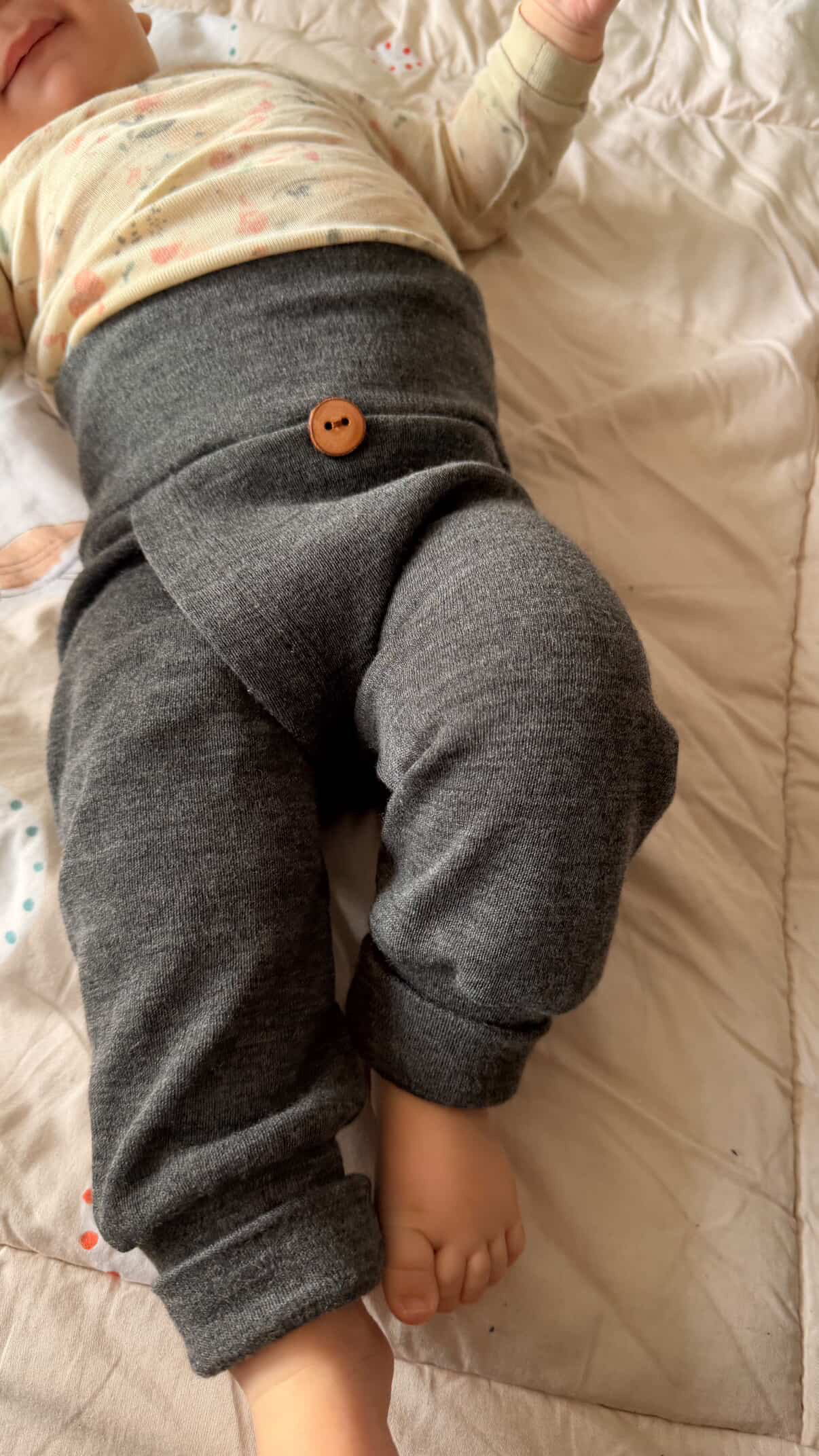 Dank der großen Öffnung im Schritt kann das Kind schnell und unkompliziert abgehalten werden können, etwas ältere Kinder können mit Split Pants bald selbständig umgehen. In den ganz großen Größen wird die Hose zum Beispiel noch als Schiunterwäsche genutzt. Da sich die Schnittteile weit überlappen, bleibt die Öffnung meist verschlossen und weil ich bewusst eine kontrastfarbige Einfassung vermieden habe sticht sie auch nicht ins Auge.